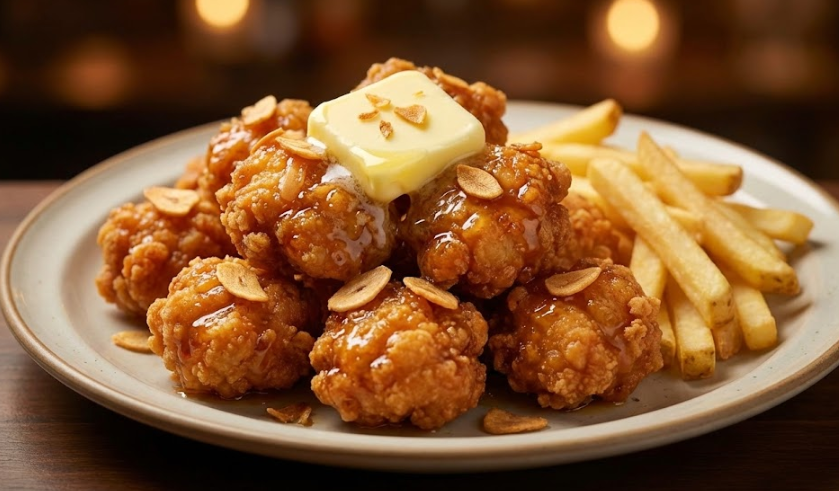 제가 가장 감탄했던 건 버터깐풍기와 계란마요 감자튀김이었습니다. 바삭하게 튀겨낸 깐풍기 위에 두툼한 버터 한 조각과 마늘 후레이크가 올라가 있는데, 뜨거운 튀김 온도에 버터가 사르르 녹아들면서 내는 풍미가 정말 압도적이에요. 새콤달콤한 깐풍 소스와 고소한 버터의 조합은 실패할 수가 없죠. 여기에 특제 계란마요 소스가 듬뿍 올라간 감자튀김을 곁들이면 단짠단짠의 진수를 맛볼 수 있습니다. 36시간 마리네이드했다는 고추바삭 유림기도 상큼한 레몬 소스와 어우러져 기름진 입안을 깔끔하게 씻어준답니다.