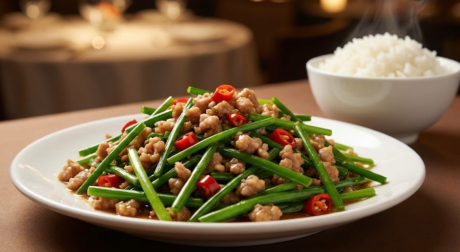이곳에 와서 이걸 안 먹고 간다면 사실상 안 간 것이나 다름없다는 말이 있을 정도로 유명한 시그니처 메뉴들이 있습니다. 첫 번째는 바로 '창잉터우(부추꽃볶음)'입니다. 잘게 썬 부추와 돼지고기, 그리고 매콤한 고추와 콩시(검은 콩 발효 장)를 센 불에 볶아낸 요리인데요. 아삭아삭 씹히는 부추의 식감과 알싸한 매운맛이 흰 쌀밥과 만났을 때의 그 조화는 정말 환상적입니다. 기름진 중화요리의 느낌을 싹 잡아주기 때문에 질리지 않고 계속 들어가게 만들죠.